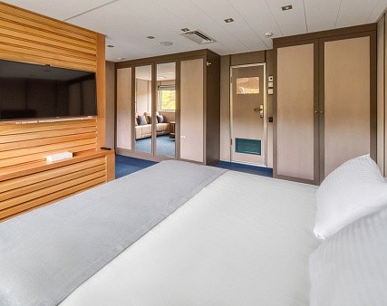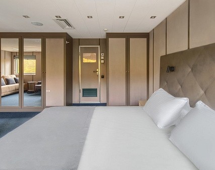 В каютах 403, 405-409, 412, 414, 419-422 (шлюпочная палуба), 323-334, 341-344 (средняя палуба) — двуспальная кровать размером 160х200 см, площадь каюты 15,5 м2