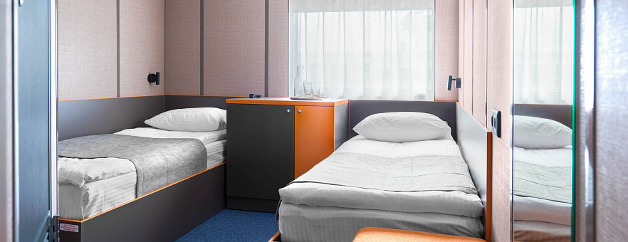 В каютах 401, 402, 404, 410, 411, 431-434 (шлюпочная палуба), 319-322, 339, 340, 345, 346, 365, 366, 369, 370 (средняя палуба) — две односпальные кровати размером 80х180 см, площадь каюты 10 м2