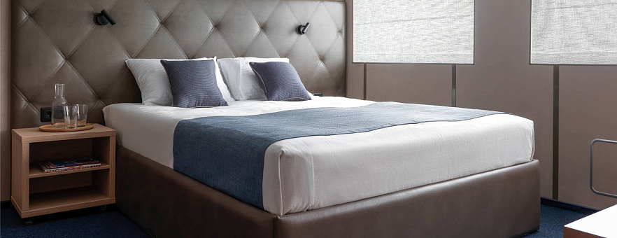 В каютах 413, 415-418 (шлюпочная палуба), 335-338 (средняя палуба) — двуспальная кровать размером 160х200 см, площадь каюты 10 м2
