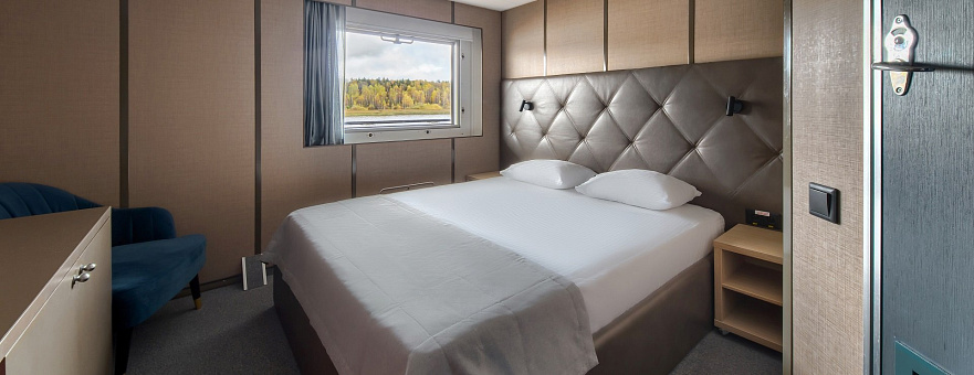 В каюте: двуспальная кровать, либо две односпальные, кресло, шкаф для одежды, пуфик, телевизор, холодильник, радио, сейф, обзорное окно, душ, санузел, кондиционер, фен, электророзетка на 220V.