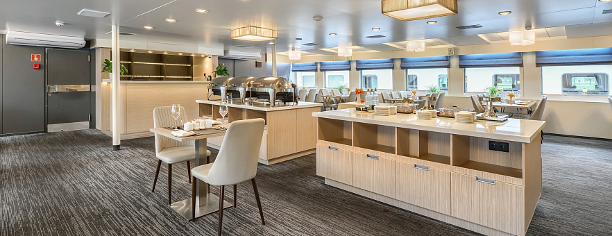 - Кондитерская – Режим работы: в туре продолжительностью 7 ночей и более – 3 раза, в туре продолжительностью 5-6 ночей – 2 раза, в туре продолжительностью 4 ночи и менее – 1 раз. Время работы: 2 часа в зависимости от времени стоянки в порту. Ассортимент включает кофейные напитки, пакетированный чай, несколько видов выпечки, мороженое, десерты и сэндвичи.