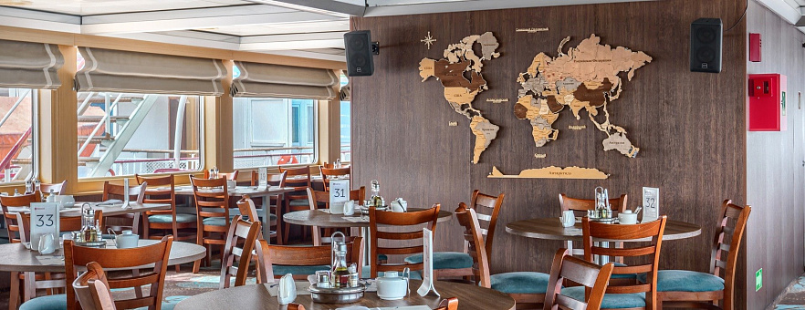 При разработке меню для ресторанов на борту наши шеф-повара вдохновлялись кулинарными традициями побережья Чёрного моря, Волги, Дона, озёрного края Северо-Запада России. Мы используем свежие локальные продукты, характерные для этих регионов, и предлагаем нашим гостям попробовать блюда, которые отражают гастрономические особенности народов нашей страны. Благодаря концепции «Родные берега», вы получите более полное представление о том месте, в котором находитесь, откроете новую палитру вкусовых ощущений и обретёте дружную компанию единомышленников.