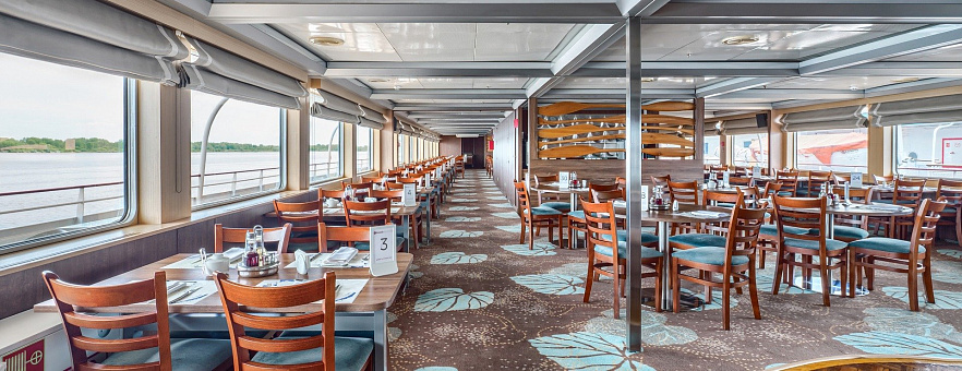 - Обед – заказная система питания (выбор блюд со 2-го дня круиза), фиксированная рассадка. Включённые напитки (без ограничения): вода, чай, кофе, морс.