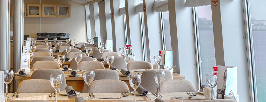 - Обед – заказная система питания (выбор блюд со 2-го дня круиза), фиксированная рассадка. Включённые напитки (без ограничения): вода, чай, кофе, морс.