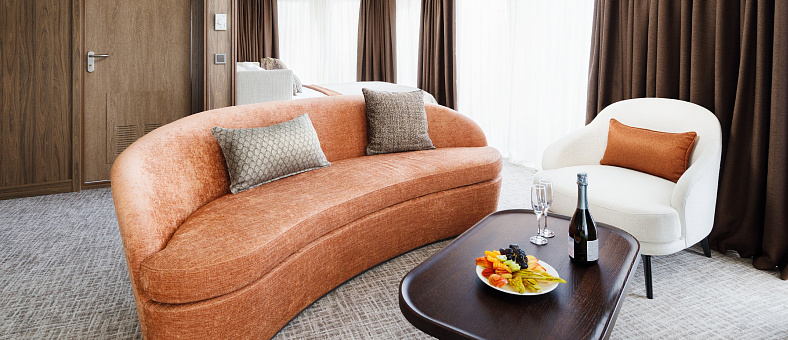 В каюте: терраса, двуспальная кровать, прикроватные тумбы, диван и два кресла, журнальный стол, туалетный столик, стул, шкаф, телевизор, холодильник, капсульная кофемашина (1 капсула в день на человека (по количеству гостей в каюте), чайник, радио, телефон, санузел с душем, кондиционер, фен, сейф, электророзетка на 220V.