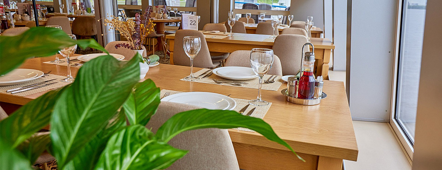 При разработке меню для ресторанов на борту наши шеф-повара вдохновлялись кулинарными традициями побережья Чёрного моря, Волги, Дона, озёрного края Северо-Запада России. Мы используем свежие локальные продукты, характерные для этих регионов, и предлагаем нашим гостям попробовать блюда, которые отражают гастрономические особенности народов нашей страны. Благодаря концепции «Родные берега», вы получите более полное представление о том месте, в котором находитесь, откроете новую палитру вкусовых ощущений и обретёте дружную компанию единомышленников.