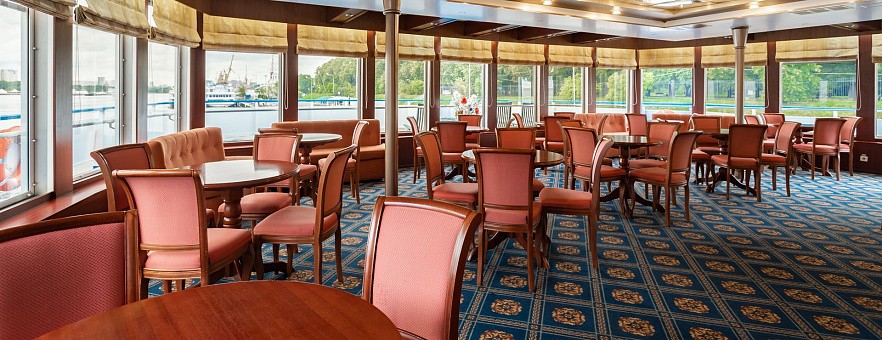 - Ужин — заказная система питания (выбор блюд со 2-го дня круиза). Включённые напитки (без ограничения): вода, чай, кофе, кисломолочный напиток (1 стакан 200 мл на ужин по запросу гостя). На выбор: вино красное / белое / игристое (1 бокал, 125 мл) / водка (1 рюмка, 50 мл) / пиво (1 бокал, 300 мл), домашний морс (1 бокал, 200 мл);