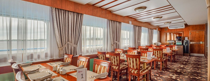 - Ужин — заказная система питания (выбор блюд со 2-го дня круиза). Включённые напитки (без ограничения): вода, чай, кофе, кисломолочный напиток (1 стакан 200 мл. на ужин по запросу гостя).