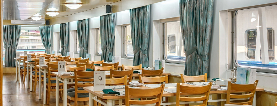 - Ужин — заказная система питания (выбор блюд со 2-го дня круиза). Включённые напитки (без ограничения): вода, чай, кофе, кисломолочный напиток (1 стакан 200 мл. на ужин по запросу гостя).
